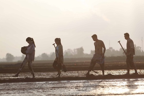 | Người đẹp không hề ngần ngại ngồi bệt trên cánh đồng đầy bùn đất. Ảnh: Facebook đoàn phim |