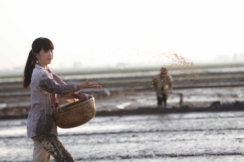 | Vốn sinh ra từ đồng ruộng nên những cảnh quay Ngọc Trinh ôm thúng mạ ra đồng làm ruộng không quá khó khăn với Ngọc Trinh. Ảnh: Facebook đoàn phim |