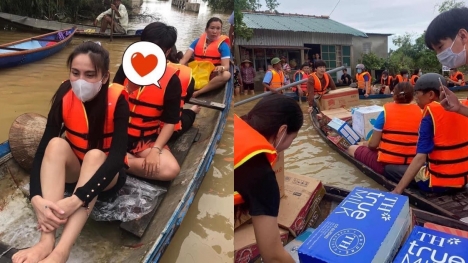 Thủy Tiên xắn quần, ngồi co ro trên chiếc thuyền bé xíu để đi cứu trợ khiến fans xúc động