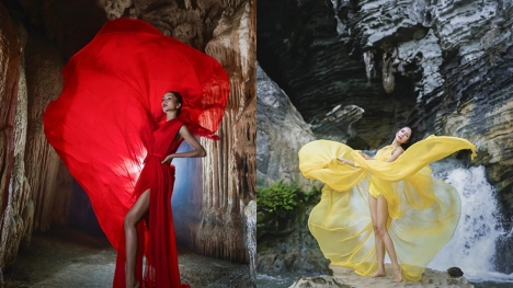 H'Hen Niê khoe dáng đồng hồ cát, đôi chân cực phẩm dài 1m13 bên trong hang động và bên thác nước.
