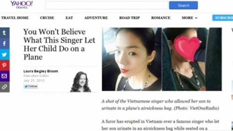 Sự việc nữ ca sĩ cho con đi tiểu trong túi nôn ngay trên máy bay gây xôn xao cư dân mạng Việt Nam đã được hai trang thông tin khá nổi tiếng ở nước ngoài dẫn lại theo hướng tiêu cực.