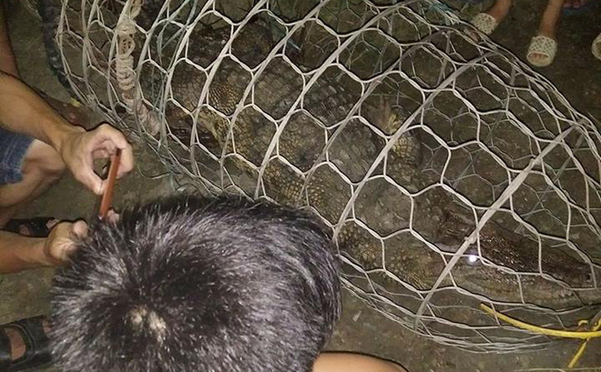 Trong lúc đi bắt cá ở sông Tích, bất ngờ nhìn thấy một con cá sấu đang bơi trên sông, người dân ở Quốc Oai, Hà Nội đã bắt sống con vật này về nhà.