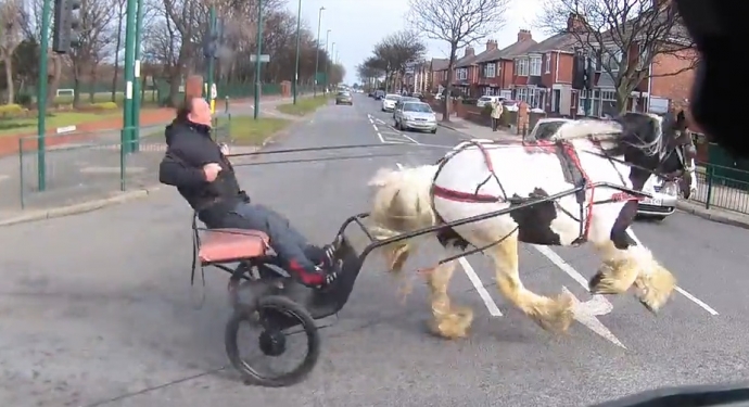Trong khi các dòng xe đang di chuyển trên đường, một người đàn ông cưỡi cỗ xe ngựa lao qua đường với tốc độ cao, khiến người đi đường hốt hoảng.[mecloud]ku2hq4Wz8J[/mecloud]