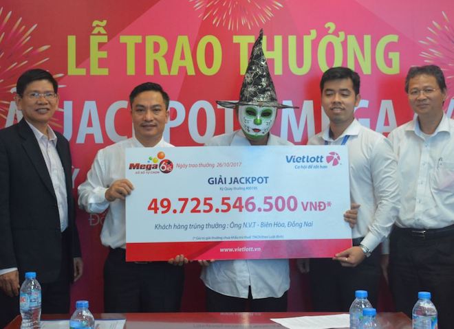 Với số tiền nhận thưởng lên đến gần 50 tỷ đồng, ông T. đã sử dụng chiếc mặt nạ theo phong cách mặt quỷ cùng với nón phù thủy thường thấy trong lễ hội Halloween.