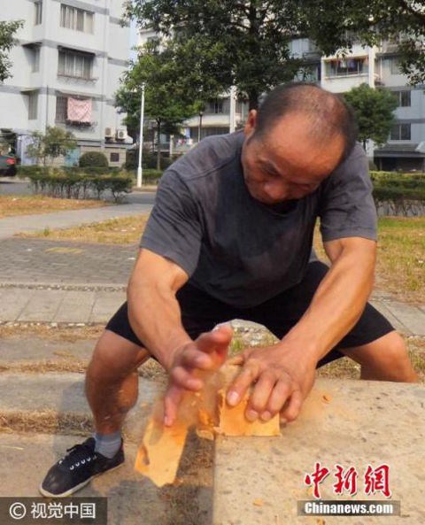| Ngoài ra ông còn có khả năng dùng tay chặt gạch. Ảnh: Shanghaiist |