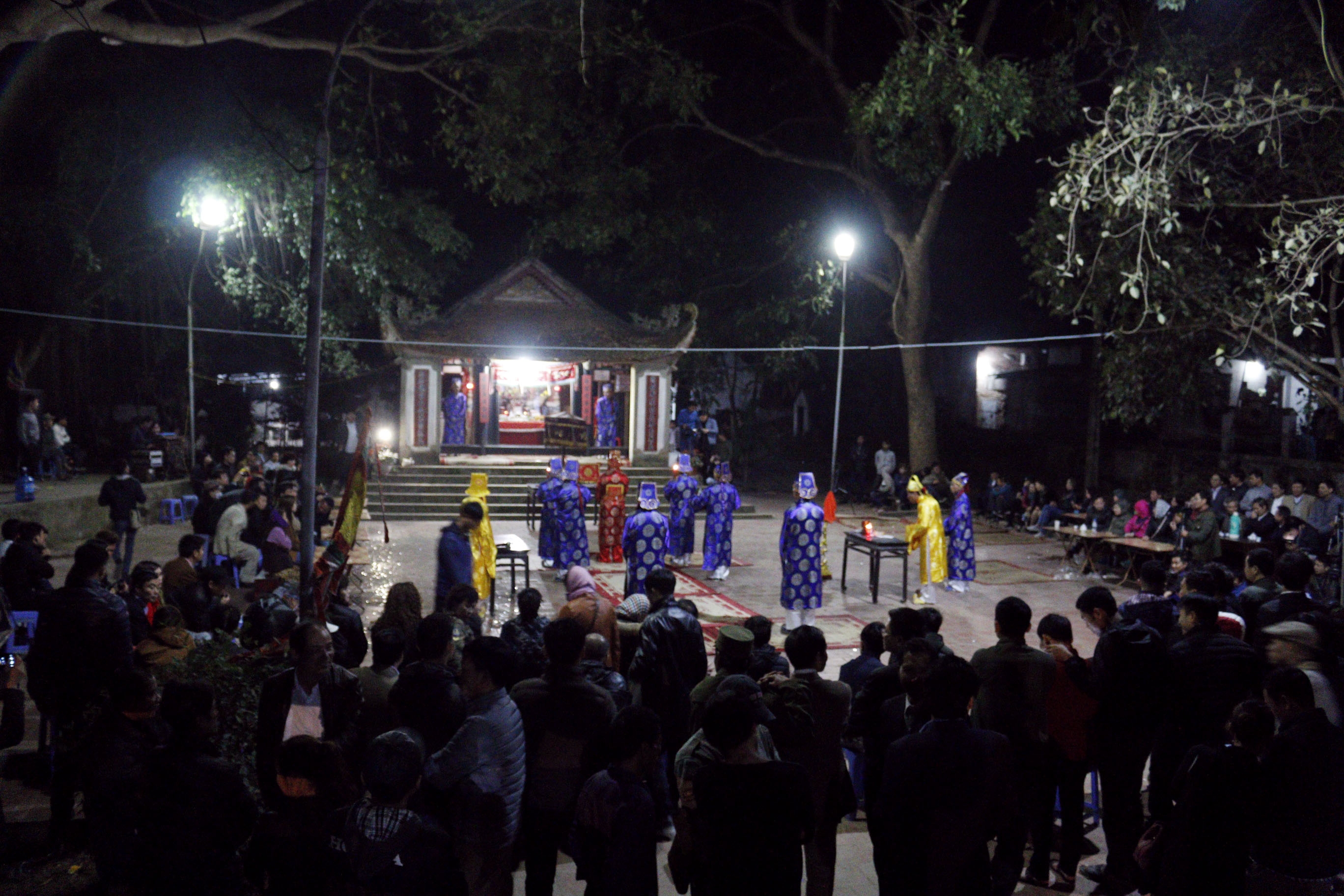 | Vào khoảng 00h - thời khắc chuyển giao từ ngày 11 sáng ngày 12 tháng Giêng Âm lịch, người dân đã kéo đến miếu Đụ Đị để mong muốn tận mắt xem đôi trai gái "làm chuyện ấy" trong miếu. |