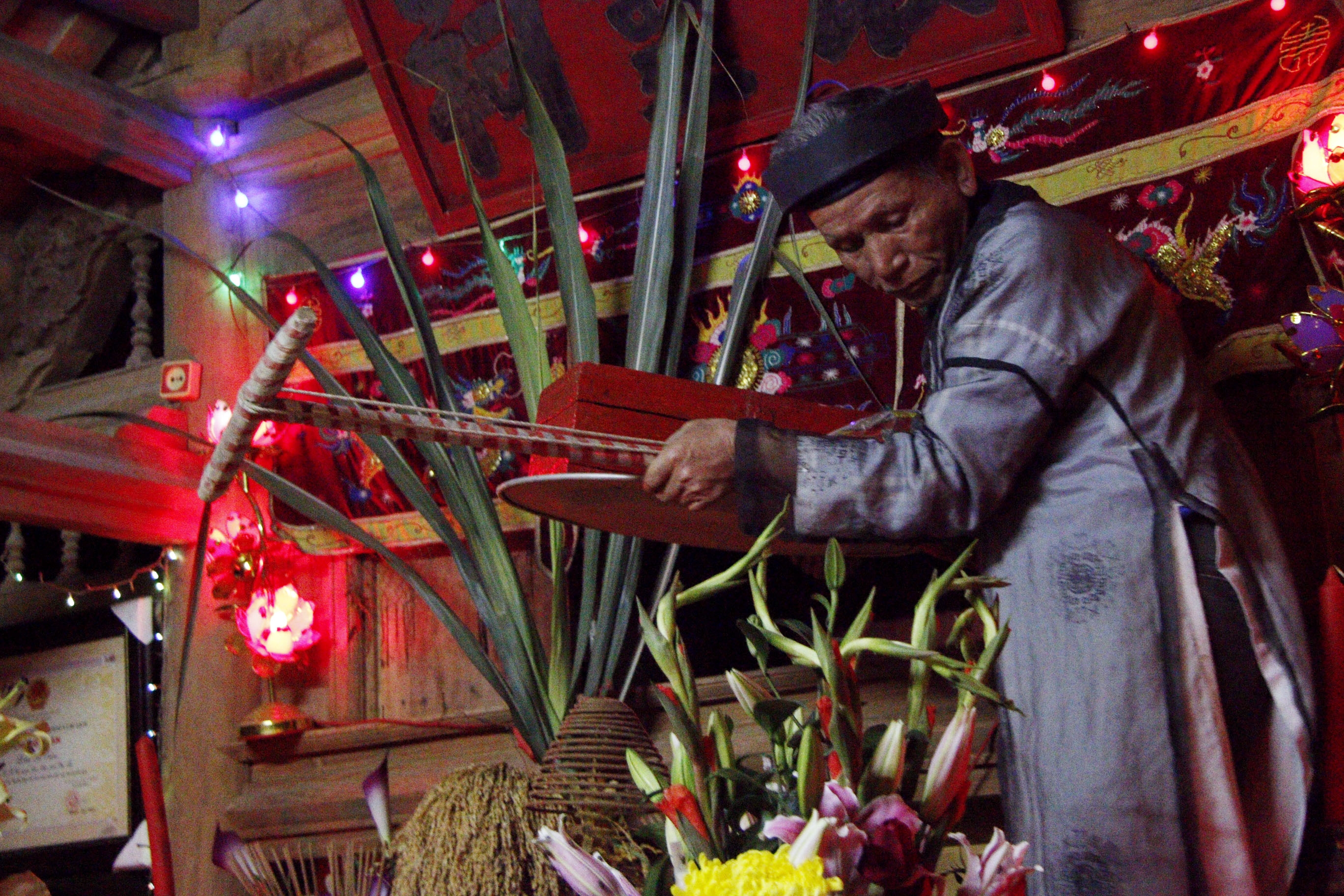 | Cụ chủ từ làm nghi thức Lễ Mật trước khi thực hiện nghi thức hòa hợp âm dương. Vợ chồng anh Chiến đứng hai bên trong cụ Ngữ trước sự chứng kiến của hang trăm ánh mắt tò mò. |