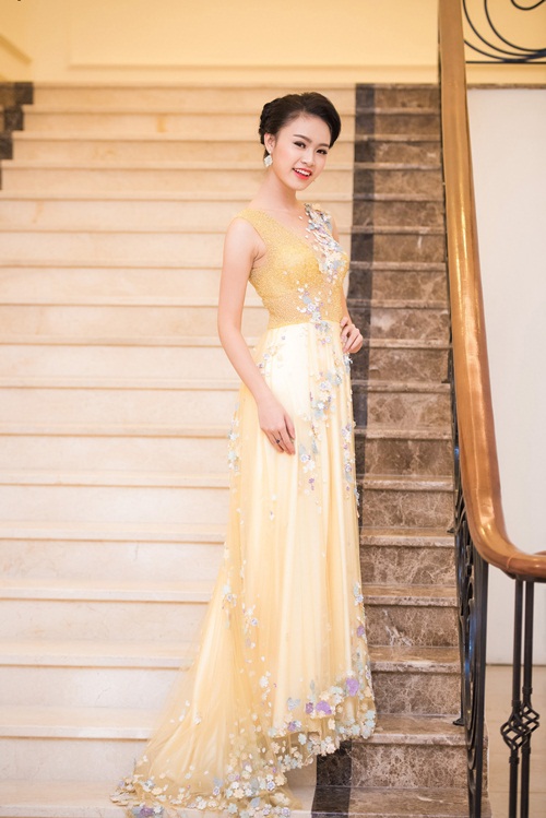 Mới đây khi tham gia một sự kiện của Hội doanh nhân trẻ Hà Nội, Ngọc Vân xuất hiện đầy ấn tượng với tư cách khách mời trong bộ đầm dạ hội màu vàng nhạt đính kết cầu kỳ. |