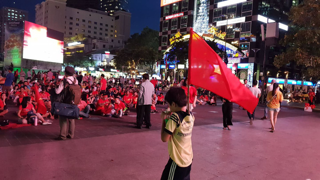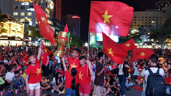 Phố đi bộ Nguyễn Huệ ngập tràn sắc đỏ khi nhiều người hâm mộ tập trung tại đây để theo dõi và cổ vũ cho đội tuyển Việt Nam trong trận chung kết AFF Cup 2018.