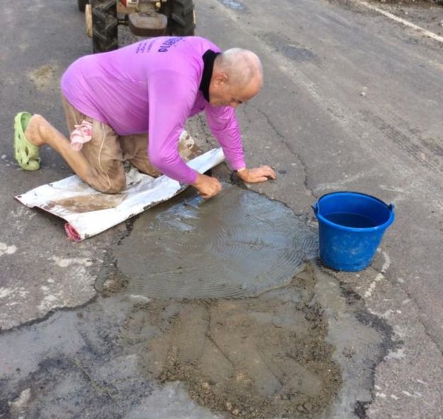 | Ông Peter Goman đang vá lại ổ gà trên đường gần nhà. Ảnh: BBC |