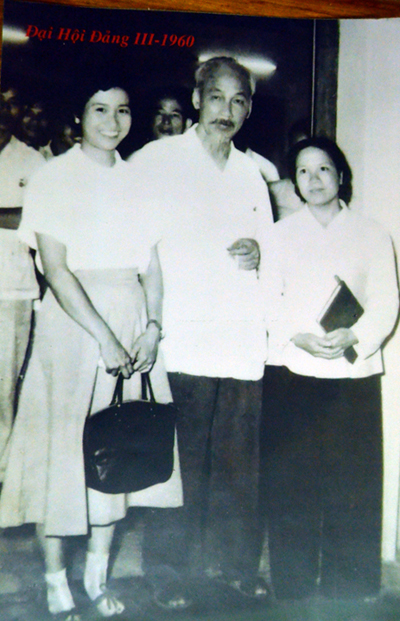 | Bà Bích Thuận (ngoài cùng bên phải) chụp ảnh cùng với Bác Hồ. |