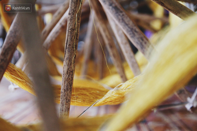 Để lấy được tơ sen, bà Thuận dùng dao khứa xung quanh cuống sen, rồi dùng tay vặn và kéo tơ, đồng thời ve cho sợi tơ sen tròn lại. Nếu cắt quá sâu sẽ làm đứt luôn phần sợi tơ bên trong. Đó là lý do những sợ tơ trông có vẻ mềm mại, dịu dàng nhưng lại cực kỳ kiêu sa đòi hỏi sự khéo léo, tinh tế từ bàn tay người nghệ nhân.