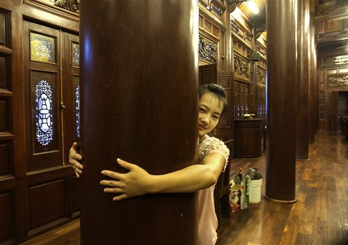 | Với thiết kế này, ngôi nhà tuy bằng gỗ nhưng còn bền vững hơn nhà bê-tông cốt thép, có thể tồn tại giữa trời đất hàng trăm năm. Đế cột được đúc bằng đồng nguyên chất với khối lượng 3,5 tấn. |