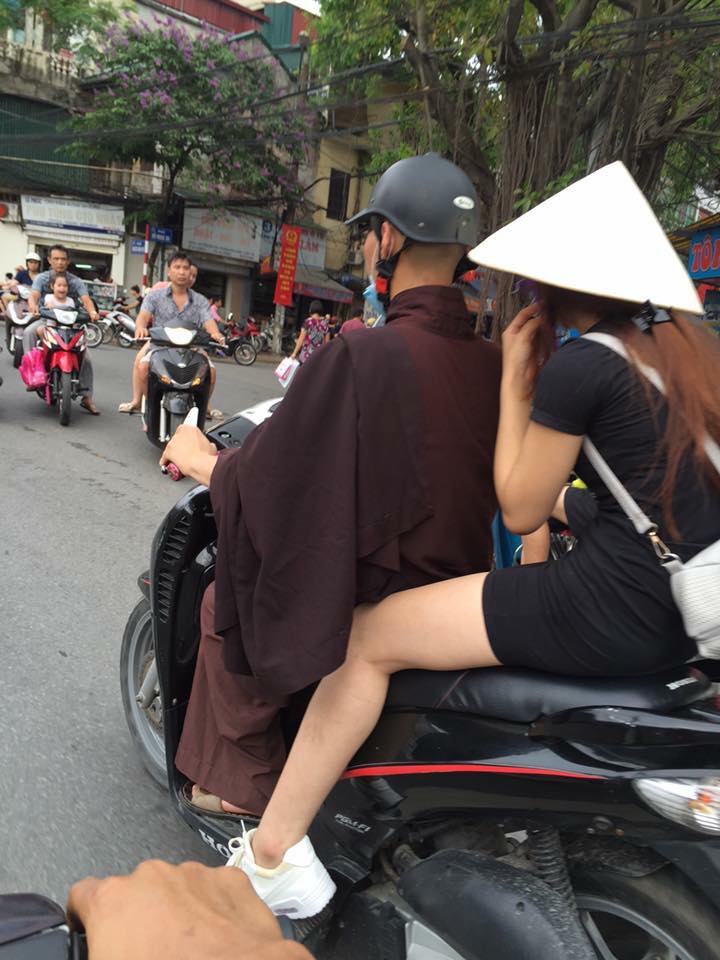 Mới đây, trên fanpage của một diễn đàn mạng xã hội Facebook xuất hiện hình ảnh một người đàn ông đầu trọc mặc trang phục của nhà tu hành, điều gây chú ý là vị này chạy xe SH chở sau một cô gái trong khi đó cả 2 đều không đội mũ bảo hiểm.