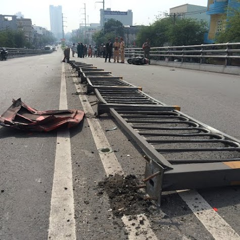 | Giải phân cách bị xe khách tông đổ sập |