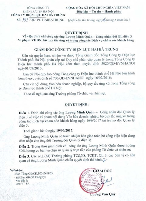 Trên VnExpress đưa tin, chiều 18/5, lãnh đạo công ty điện lực Hai Bà Trưng cho biết đã ra quyết định đình công tác đối với anh Lương Minh Quân, công nhân đội quản lý điện 3 vì có những thái độ không đúng mực với khách hàng; quyết định có hiệu lực từ ngày 19/6. Công ty cũng gửi văn bản xin lỗi đến khách hàng.