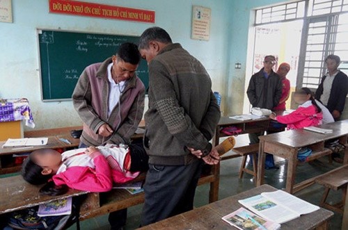 | Bác sĩ kiểm tra sức khỏe cho một học sinh mắc bệnh lạ. Ảnh: Báo Đắk Lắk |