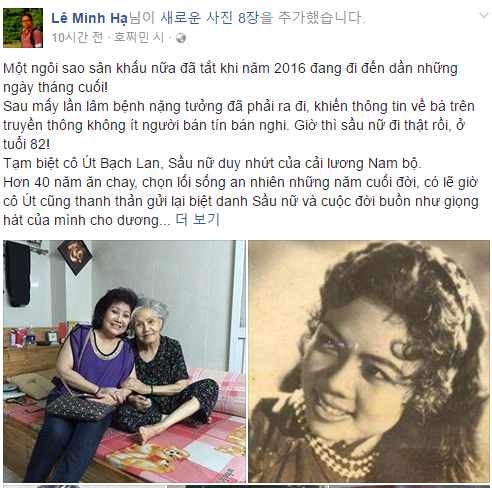 | Trên trang cá nhân nhà báo Lê Minh Hạ, anh chia sẻ những hình ảnh thời trẻ của sầu nữ Út Bạch Lan nhận được nhiều lượt chia sẻ và bình luận từ phía khán giả. |