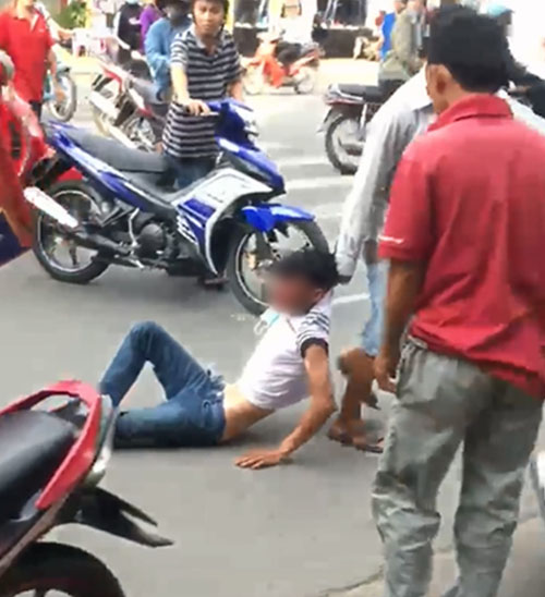 Vụ việc xảy ra trên đường Lê Trọng Tấn, quận Tân Phú, TP. HCM. Thanh niên xấu số này liên tục phải nhận những cú đá mạnh vào đầu, thậm chí một người đàn ông còn dùng cả dép để tát liên hồi vào mặt thanh niên, nạn nhân chỉ biết bất lực lấy tay che chắn rồi nằm vạ ra đường.