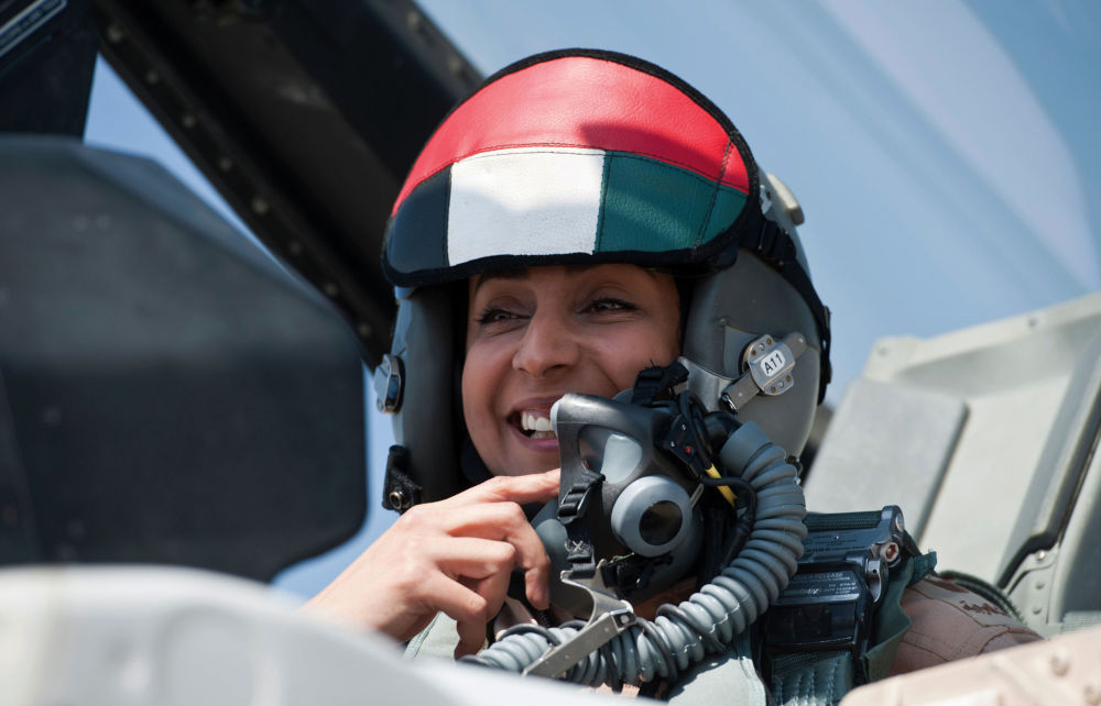 | Thiếu tá Mariam al-Mansouri, phi công nữ đầu tiên của Không quân UAE bên trong buồng lái của chiến đấu cơ F-16. Ảnh: WAM |