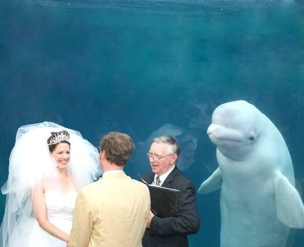 Một đôi vợ chồng tổ chức lễ cưới dưới thủy cung Mystic Aquarium tuyệt đẹp ở bang Connecticut, Mỹ trước sự chứng kiến của chú cá heo trắng vô cùng đáng yêu.
