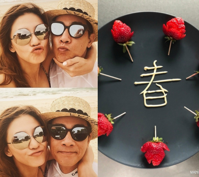 | Hai vợ chồng Trần Tiểu Xuân - Ứng Thái Nhi quyết định đi biển nghỉ ngơi, kỷ niệm 7 năm kết hôn. Cô nàng trổ tài tỉa dâu tây thành 7 bông hoa hồng nhỏ, còn dùng phomai viết tên chồng "Xuân" bày biện trang trí |