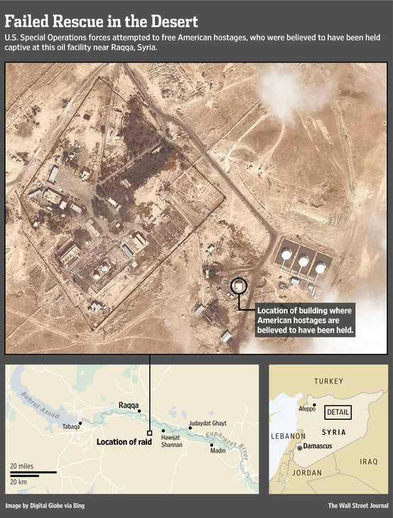 Đầu mùa hè, các cơ quan tình báo Mỹ thu hẹp phạm vi tìm kiếm các con tin người Mỹ xuống chỉ còn tòa nhà nhỏ gần một cơ sở sản xuất dầu ở Đông Nam Raqqa, một thành trì của IS. Tổng thống Obama bí mật cho phép lực lượng đặc nhiệm bắt đầu sứ mệnh giải cứu. Nhiệm vụ này do Lầu Năm Góc dẫn đầu cùng với sự hỗ trợ từ Cơ quan Tình báo Trung ương (CIA).