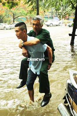 Trong ngày 25/5, khi Hà Nội "phố cũng như sông" trên mọi tuyến đường, thì xuất hiện một số hình ảnh các chàng trai hay những người con cõng người thân của mình qua đường hay sửa xe miễn phí giúp người dân. Những "soái ca" có thật này đã làm dân mạng được dịp xuýt xoa.