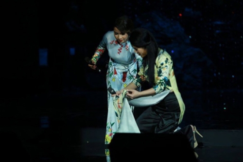 | Diva Mỹ Linh giúp Thu Phương đứng dạy sau khi bị ngã. Ảnh internet |