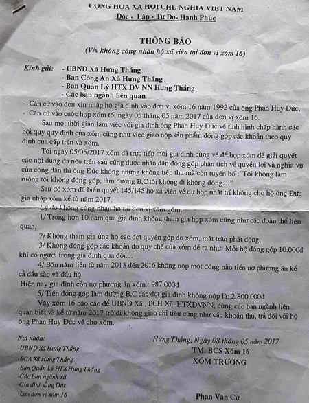 Vài hôm sau, hộ của ông Đức nhận được thông báo giắt ở bờ rào với nội dung "Không công nhận hộ xã viên tại đơn vị xóm 16", gửi UBND xã và các ban ngành, "tố" ông Đức 10 năm không tham gia họp xóm, không ủng hộ các đợt quyên góp, còn nợ tiền phương án 987 nghìn, nợ 2,8 triệu tiền đóng góp làm đường bêtông.