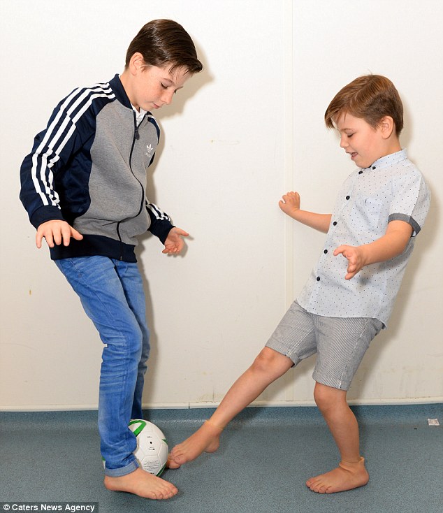 | Với đôi chân giả, hai cậu bé có thể thoái mái chạy nhảy và chơi đá bóng như mơ ước. Ảnh: Daily Mail |