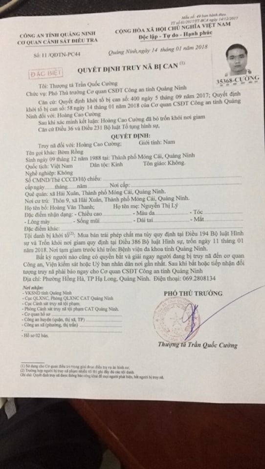 Ngày 14/1, cơ quan CSĐT Công an tỉnh Quảng Ninh đã ra quyết định truy nã 2 đối tượng này.