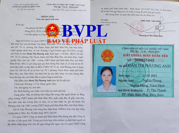 Ngay sau khi nhận được đơn trình báo, Công an TP Điện Biên Phủ (Điện Biên) đã tiếp nhận đơn trình báo của anh Đoàn Văn H. (SN 1979, trú tại tổ 23, phường Tân Thanh) về việc con gái bị mất tích.