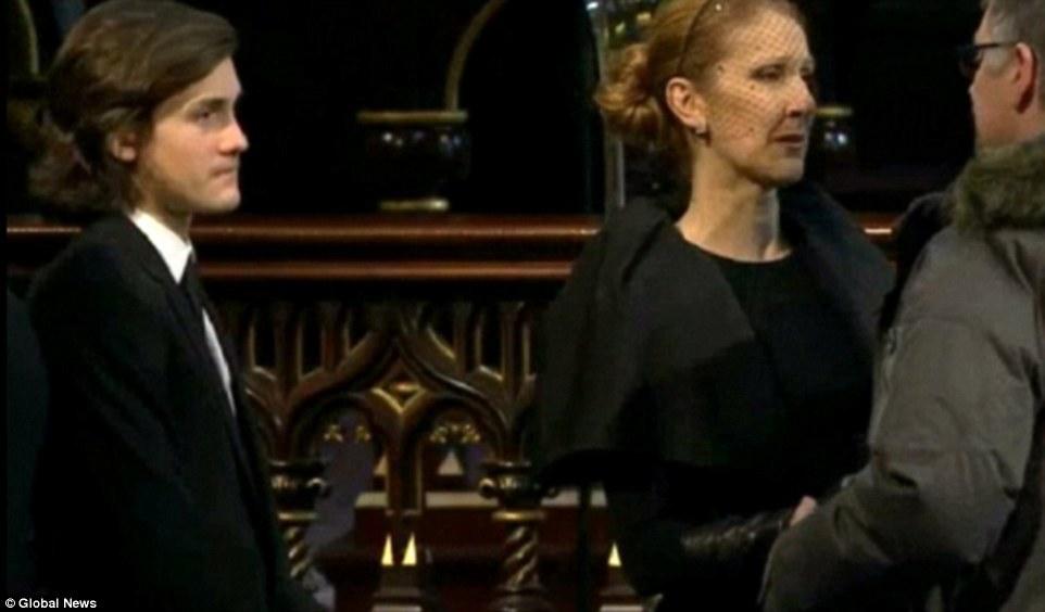 | Celine Dion mặc bộ trang phục đen và đeo màn đen trước mặt. Cô không giấu nổi sự đau buồn cùng những giọt nước mắt tiếc thương bên linh cữu chồng - nhà sản xuất âm nhạc Rene Angelil. |