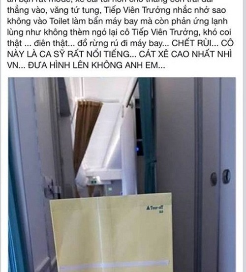 Tác giả này viết: "Khi chiếc máy bay A350 xinh đẹp mới cáu còn thơm mùi mới gần đáp (cao độ 9000m - vẫn có thể toilet được), một vị khách nữ xinh đẹp số ghế 11B, 10 ngón tay sơn 10 màu, ăn bận rất mode, xé cái túi nôn cho thằng con trai đái thẳng vào, văng tứ tung. Tiếp viên trưởng nhắc nhở sao không vào toilet, làm bẩn máy bay, nữ hành khách này còn phản ứng lạnh lùng, không thèm ngó lại cô Tiếp viên trưởng. Khó coi thật... điên thật... đồ rừng rú đi máy bay. Chết rồi... cô này là ca sỹ rất nổi tiếng... cát xê cao nhất nhì Việt Nam...".