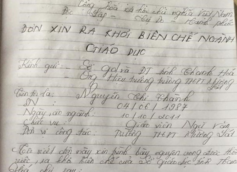 Theo chia sẻ, cô Thành vào công tác trong ngành giáo dục từ tháng 10/2011: “Bản thân tôi khi cố gắng bám nghề cũng phải sống trong hoàn cảnh không được thoải mái, điều kiện sinh hoạt thiếu thốn do đồng lương quá ít ỏi, không đủ lo cho cuộc sống của gia đình và các con”, cô Thành cho biết viết trong đơn này xin trình bày nguyện vọng được thôi việc, ra khỏi biên chế của Sở GD&ĐT Thanh Hóa.