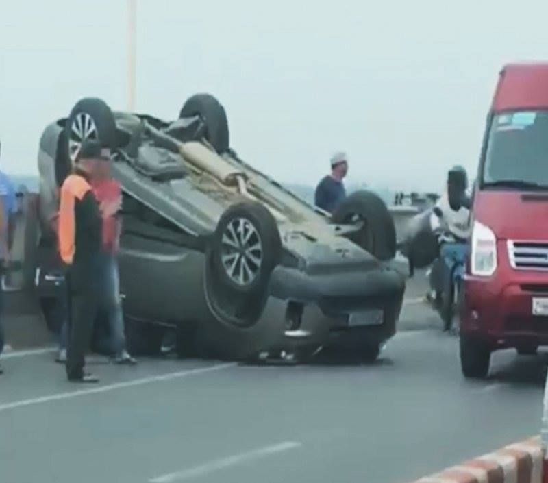 May mắn, nữ tài xế chỉ bị thương nhẹ sau vụ tai nạn. Tại hiện trường, biển báo ở dải phân cách giữa đã bị đổ ra đường, xe ô tô bị lật ngửa và hư hỏng khá nặng.