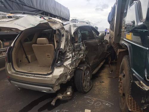 Chiếc xe ô tô 7 chổ bị cán nát phần đuôi xa và phần thân xe bên phải, hư hỏng nặng, xe tải cũng bị móp méo phần đầu. 5 người trên xa may mắn không ai bị thương.