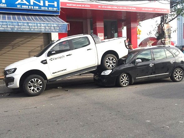 Cú va chạm liên hoàn tại TP.Đà Nẵng khiến tài xế 2 xe máy bị thương nặng. Tài xế xe ô tô 4 chỗ hốt hoảng tháo chạy ra ngoài trong tình thế phần đầu chiếc ô tô của mình bị đè bẹp bởi xe bán tải.