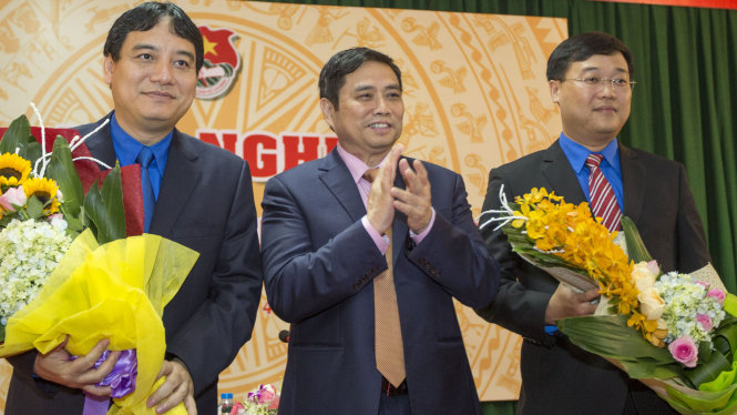 Ông Phạm Minh Chính - Ủy viên Bộ Chính trị, Trưởng ban Tổ chức Trung ương, tặng hoa cho nguyên Bí thư thứ nhất Trung ương Đoàn Nguyễn Đắc Vinh (trái) và tân Bí thư thứ nhất Trung ương Đoàn Lê Quốc Phong tại Hội nghị Ban chấp hành Trung ương Đoàn khóa X - Ảnh: Việt Dũng/Tuổi trẻ |