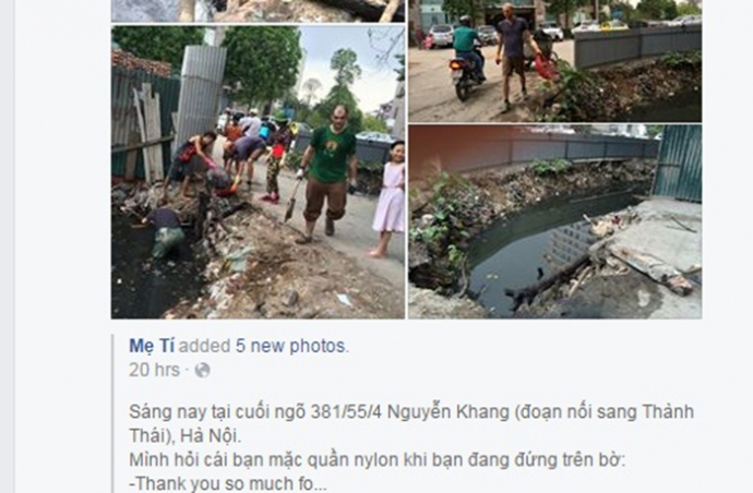 Ngày 15/5, Facebook có tên Mẹ Tí chia sẻ những hình ảnh các ông Tây mặc quần nilon dọn cống thối ngập rác ở cuối ngõ 381/55/4 đường Nguyễn Khang (Hà Nội).