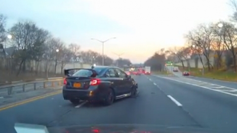 Chiếc sedan thể thao Subaru WRX STI vọt lên từ làn trong cùng rồi chuyển ngay ra làn ngoài cùng và lập tức phanh gấp khi tài xế nhận ra cả dòng xe đang dừng lại. Mọi thứ quá muộn khi Subaru hích vào dải phân cách rồi đâm vào một xe phía trước.