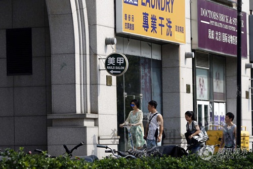 | Nữ diễn viên lái một chiếc xe đạp điện, Lý Thần đi bộ bên cạnh cùng bạn gái. |