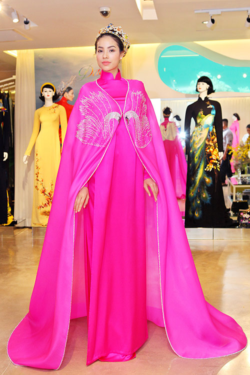 Hoa hậu Hoàn vũ Phạm Hương vô cùng xinh đẹp, lộng lẫy trong bộ trang phục áo dài được NTK Đinh Văn Thơ thiết kế riêng cho cô.