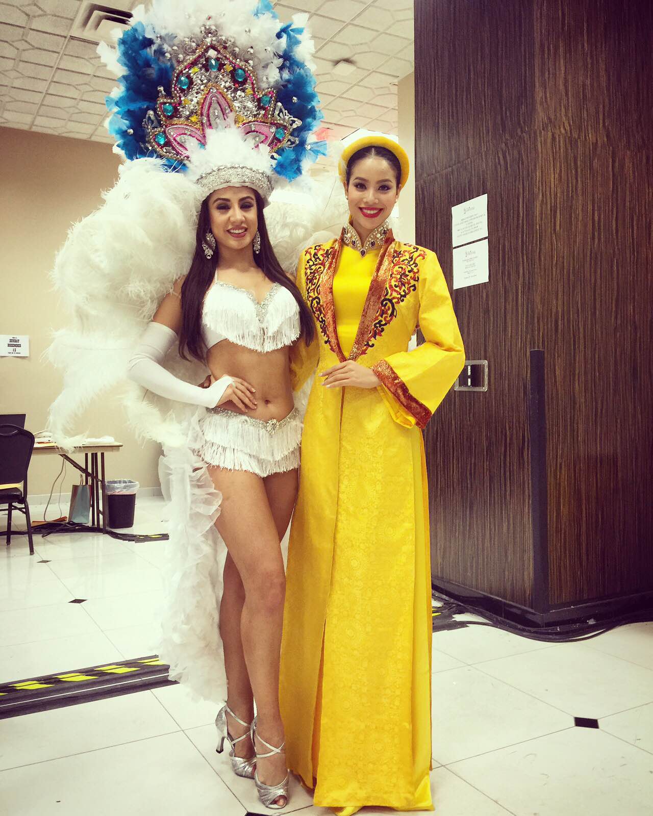 | Trang phục của Phạm Hương mặc trong phần thi tài năng là sự kết hợp của áo dài của NTK Nhật Dũng và áo choàng ngoài của NTK Thuận Việt. Bộ trang phục đẹp mắt cũng làm tăng thêm giá trị tiết mục biểu diễn của hoa hậu Phạm Hương. |