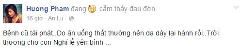 Mới đây Phạm Hương khiến nhiều người lo lắng khi đăng tải hình ảnh bị ốm phải truyền nước trên trang cá nhân. Phạm Hương viết: "Bệnh cũ tái phát. Do ăn uống thất thường nên dạ dày lại hành rồi. Trời thương cho con nghỉ lễ yên bình".