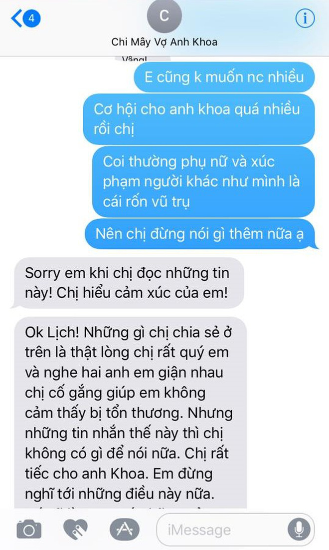 Ngoài ra, Mây Phạm đã xin lỗi Phạm Lịch khi biết chồng mình đã có lời lẽ gây tổn thương nặng nề với Phạm Lịch. Mây Phạm bày tỏ: "Nhìn thấy những tin nhắn này thì chị không còn gì để nói nữa. Chị rất tiếc cho anh Khoa. Em đừng nghĩ tới điều này nữa. Nó sẽ làm em có những cảm xúc rất tồi tệ. Chị sẽ nói chuyện với Khoa về việc này. Xin lỗi em vì chị đã làm phiền em!".