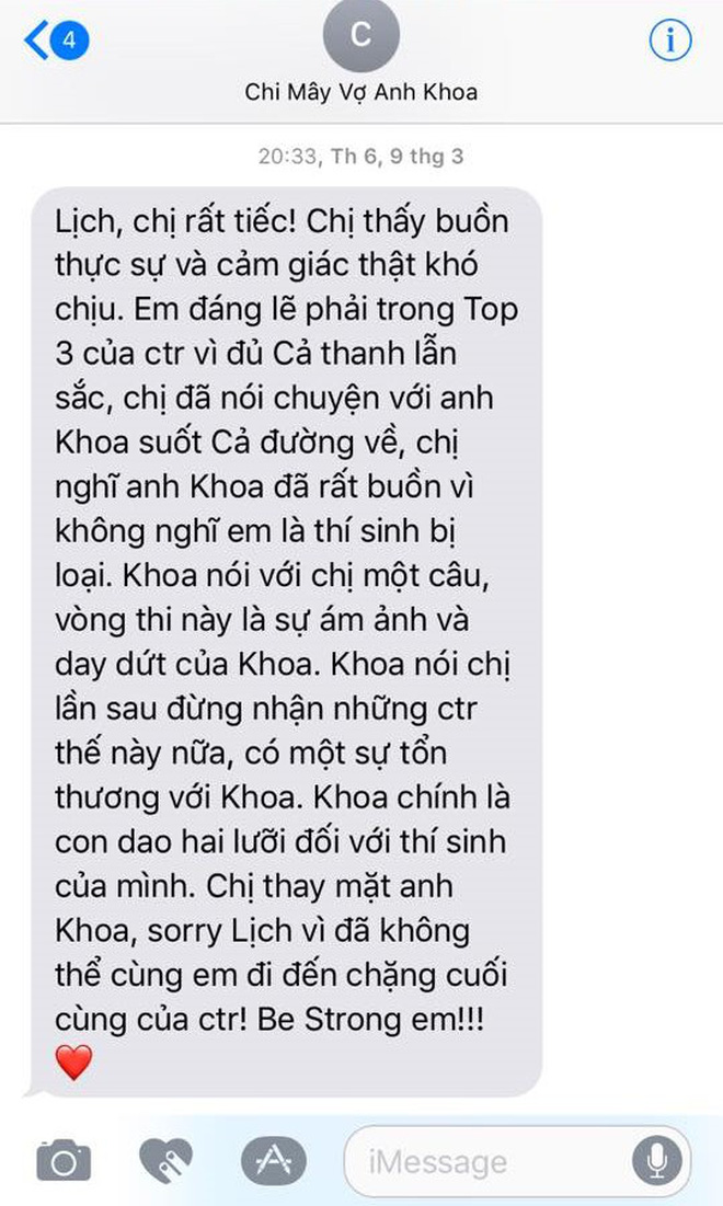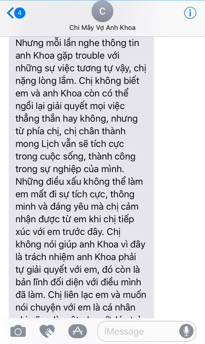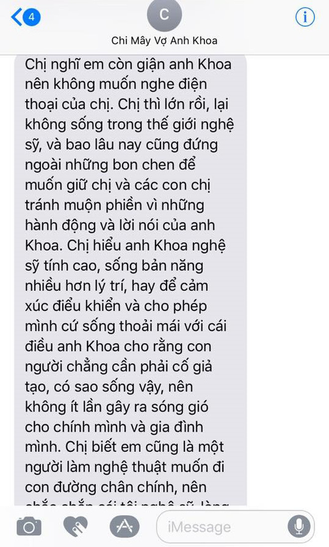 Trong tin nhắn, Mây Phạm chia sẻ khá dài, cô thừa nhận chồng sống bản năng, nhiều lần gây sóng gió gia đình. "Chị hiểu anh Khoa nghệ sĩ tính cao, sống bản năng nhiều hơn lý trí, hay để cảm xúc điều khiển và cho phép mình cứ sống thoải mái với cái điều anh Khoa cho rằng con người chẳng cần phải cố giả tạo, có sao sống vậy, nên không ít lần gây ra sóng gió cho chính mình và gia đình mình. Anh Khoa là kiểu nghệ sĩ lại dương tính mạnh, nên rất dễ chông chênh với phụ nữ, nhưng cũng rất tôn trọng và không làm gì bậy nếu không nhận được tín hiệu của đối phương. Em cứ thẳng thắn, cứ hiểu và thông cảm cho cái tật của Khoa".