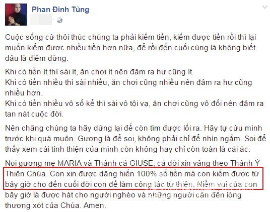 "Con xin được dâng hiến 100% số tiền mà con kiếm được từ bây giờ cho đến cuối đời con để làm công tác từ thiện. Niềm vui của con bây giờ là được hát cho người nghèo...", Phan Đình Tùng viết.