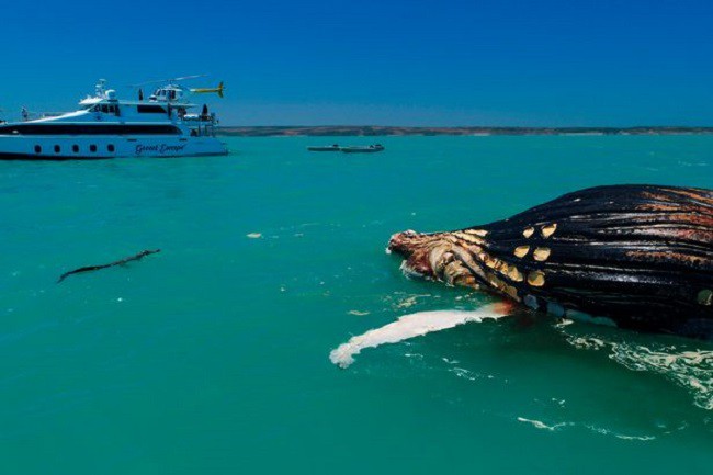 Ông Tucker cũng cho biết thêm rằng sau khi phát hiện xác chết của con cá voi, ông đã bắt đầu kiểm tra kỹ lưỡng và khá bất ngờ khi phát hiện một số con cá mập hổ và cá sấu nước mặn đang cùng nhau ăn xác của con cá voi đã chết này.